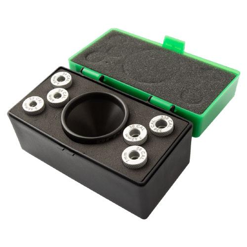 What sets the MatchMaster kit apart is its adapter system. Each adapter is precision-machined for a specific case mouth diameter, creating the tightest possible transition from funnel to case. The kit covers .22, 6mm, 6.5mm, 7mm, .30, and .338, which accounts for the most widely used precision rifle calibers. Additional adapters for calibers from .17 to .50 are available separately. With an adapter seated on the case, the funnel stays put on its own, your hands are free, and you can dispense powder without having to hold anything in place.