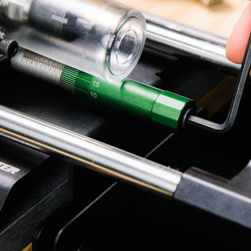 Het hart van de MatchMaster is de 3-way carbide snijkop met instelbare messen. Je duwt de huls naar voren, de sneldraaier motor doet zijn werk, en je trekt een perfect getrimde, ontbraamde en afgeschuinde huls terug. Dat scheelt enorm veel tijd ten opzichte van handmatig trimmen met losse gereedschappen, zeker bij grotere batches. De meegeleverde micrometer lengte-instelling laat je de trimlengte nauwkeurig instellen en steeds opnieuw exact reproduceren, zonder extra gereedschap.